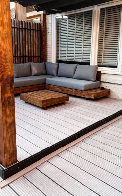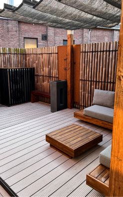 Composiet vlonderplanken netjes in halfsteens verband gelegd.
