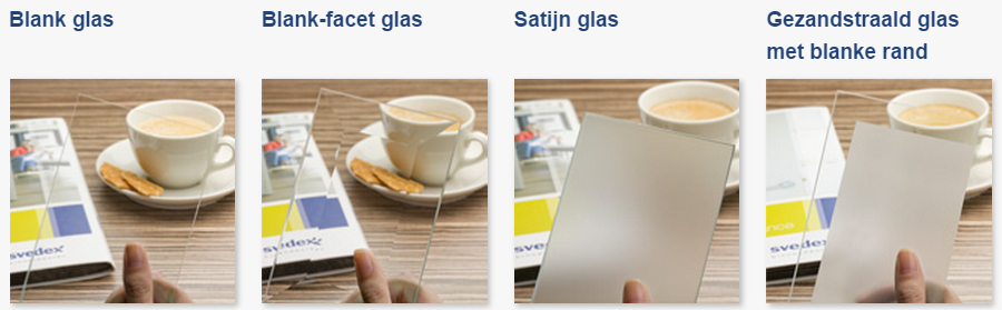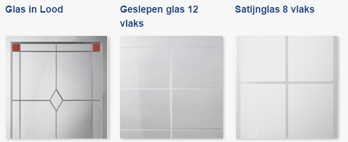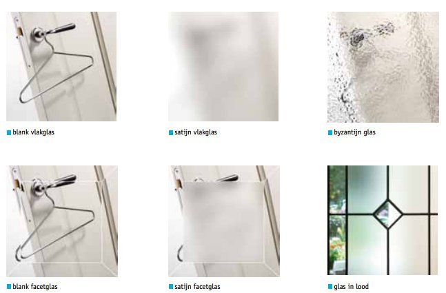 Binnendeuren uit de series Sense en Moderno worden geleverd met gemonteerd glas. Binnendeuren uit de andere series kunnen tegen meerprijs voorzien worden van gemonteerd glas. Zie hier de glassoorten van het merk Svedex: